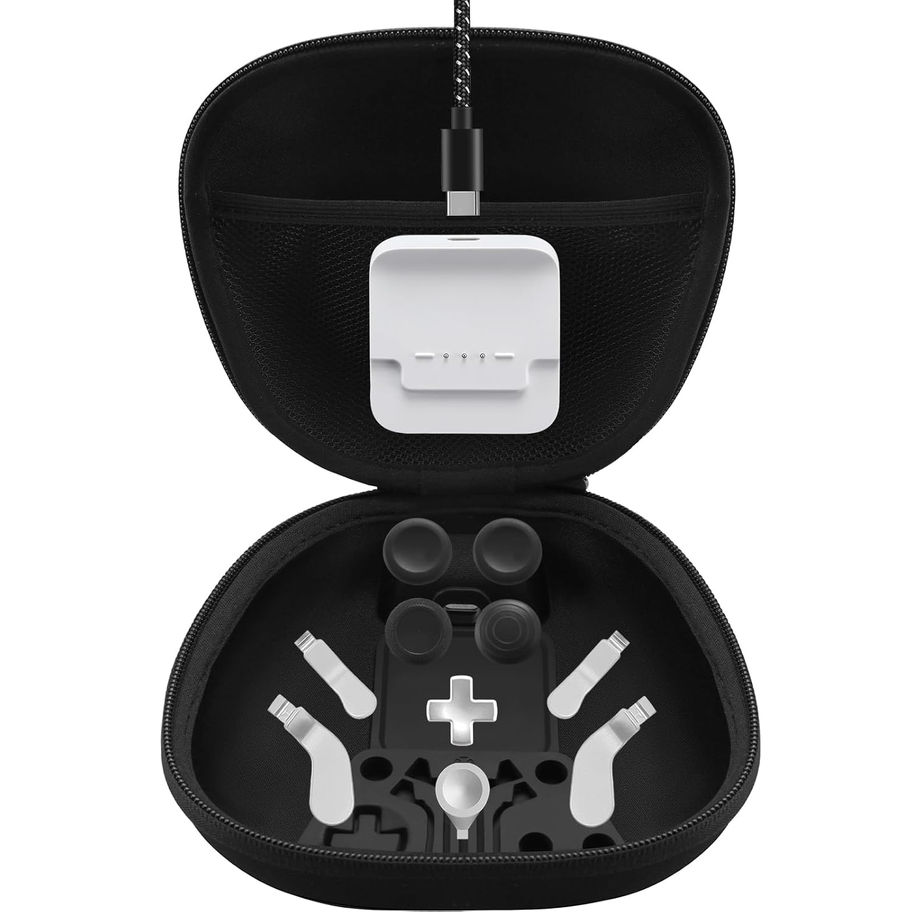 - The package includes: 1 Carrying Case, 1 Charging Dock, 4 Thumbsticks, 4 Paddles, 1 Dpad, 1 Charging Cord and 1 Adjustment Tool.And there's a brand new packaging box!